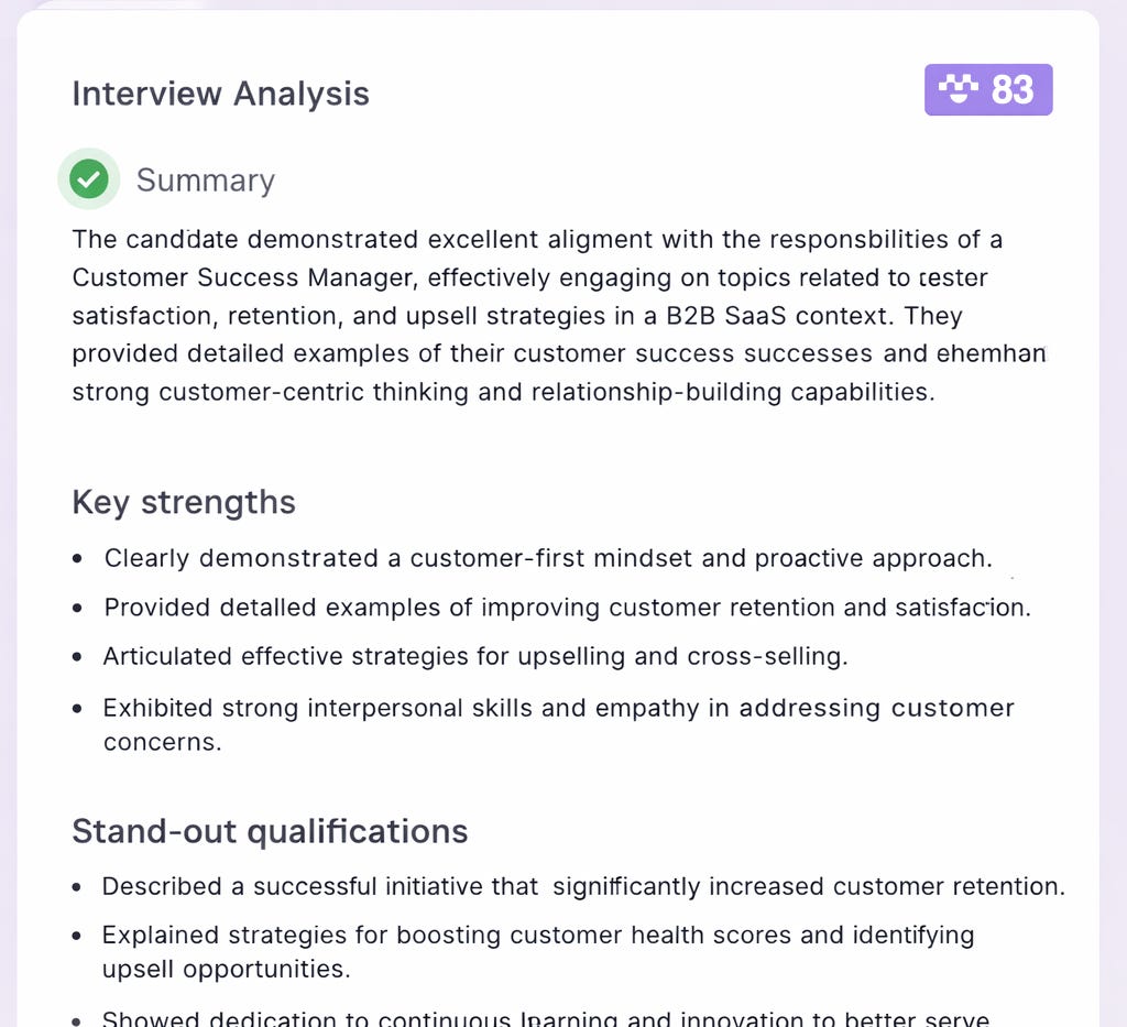 That includes full transcripts, highlights and key moments, question-by-question breakdowns, strengths, gaps, and concerns with direct context, and a transparent score tied to role criteria.