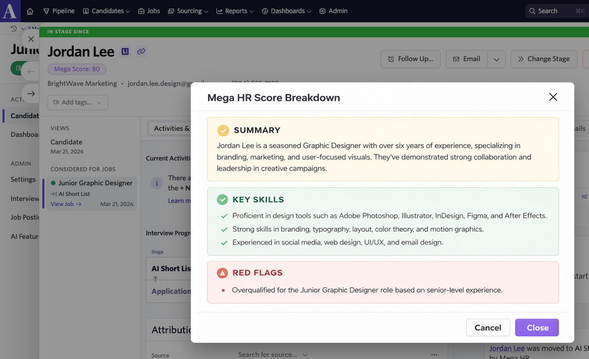 Mega evaluates every candidate against role-aware criteria, looking beyond keywords to assess real experience, trajectory, and fit.