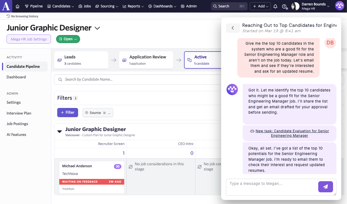 Megan acts as a conversational AI hiring partner inside your workflow, handling the constant stream of small tasks that slow teams down, while keeping candidates and stakeholders moving forward.