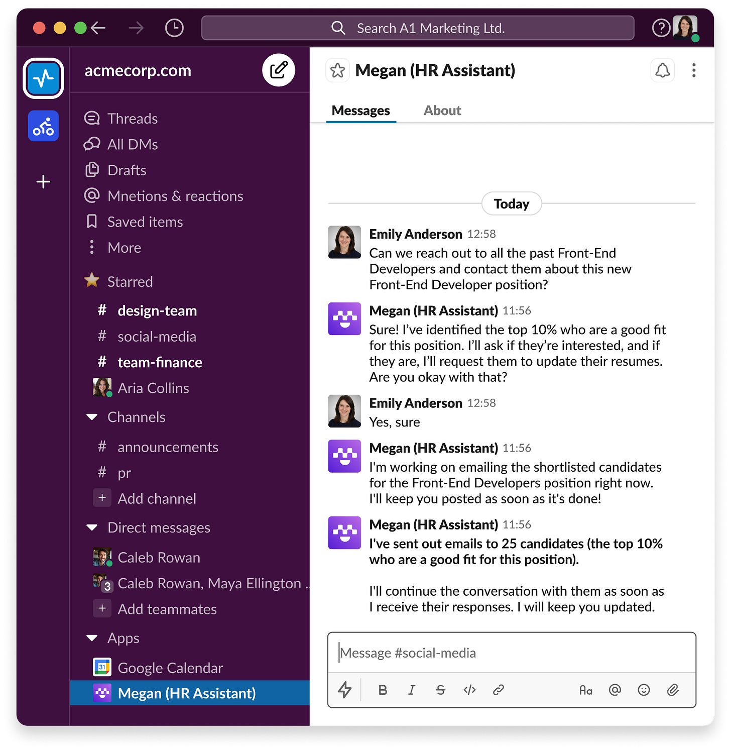 Candidates get reviewed at scale. Outreach happens instantly. Responses go out in parallel. Interviews get booked automatically. Data stays perfectly in sync. Recruiters get time back. And your team finally has a conversational AI teammate who can operate at true enterprise scale.